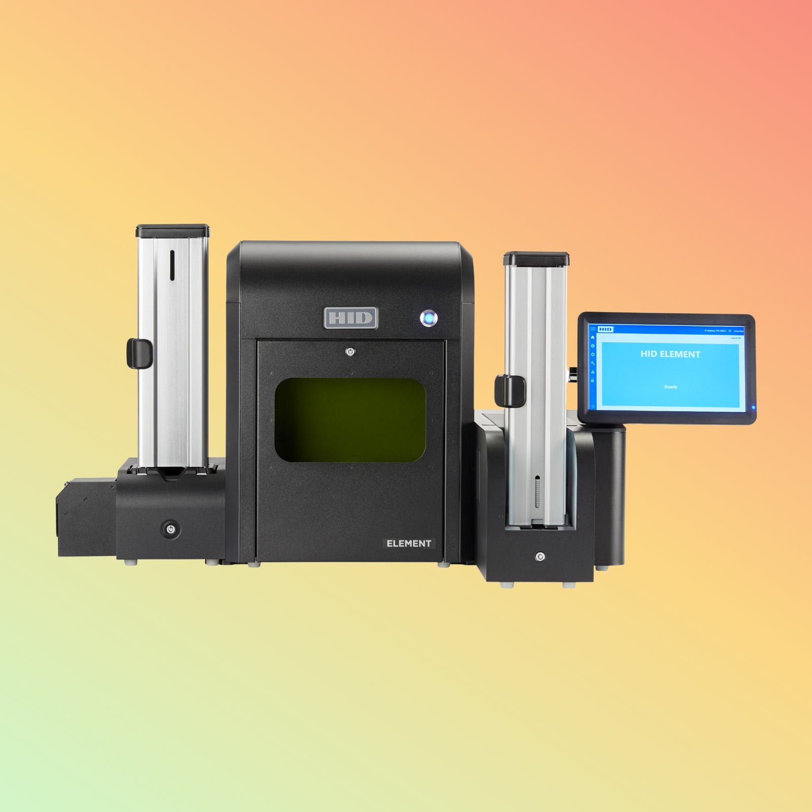 طابعة بطاقات Fargo HID ELEMENT UV النافثة للحبر والليزر مثالية لإنتاج بطاقات هوية وبطاقات مالية عالية الجودة للبرامج واسعة النطاق. وهي مثالية لبرامج الهوية الحكومية، والمؤسسات المالية، والمؤسسات التجارية، ومكاتب الخدمات التي تحتاج إلى تخصيص كميات كبيرة من البطاقات.