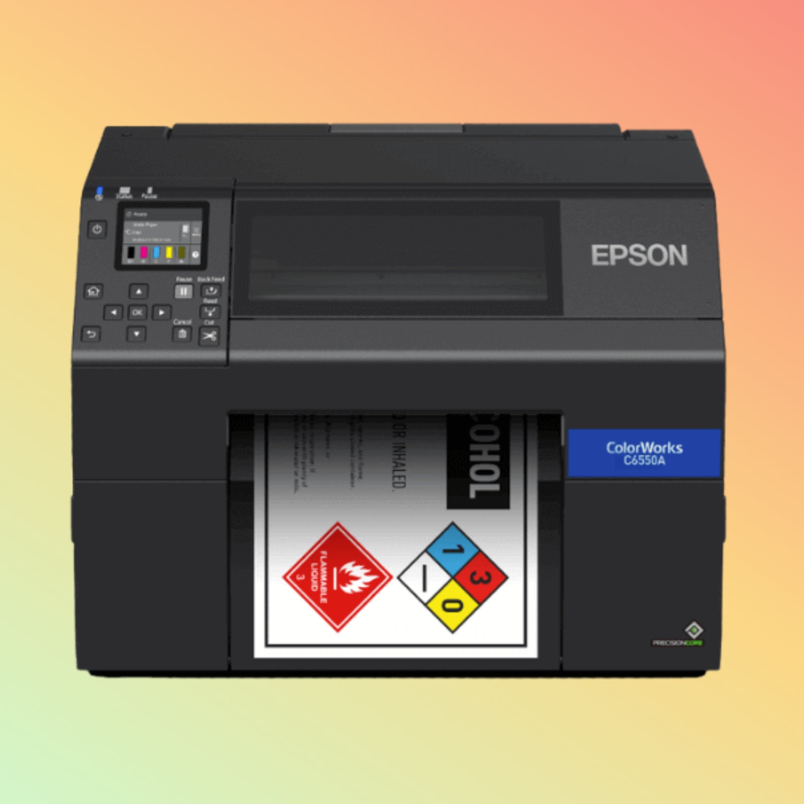 Epson ColorWorks C6550A के साथ उत्पादकता बढ़ाएँ, यह एक 8-इंच कलर लेबल प्रिंटर है जिसमें ऑटो-कटर, उच्च-रिज़ॉल्यूशन प्रिंटिंग (1200dpi) और निर्बाध कनेक्टिविटी है।