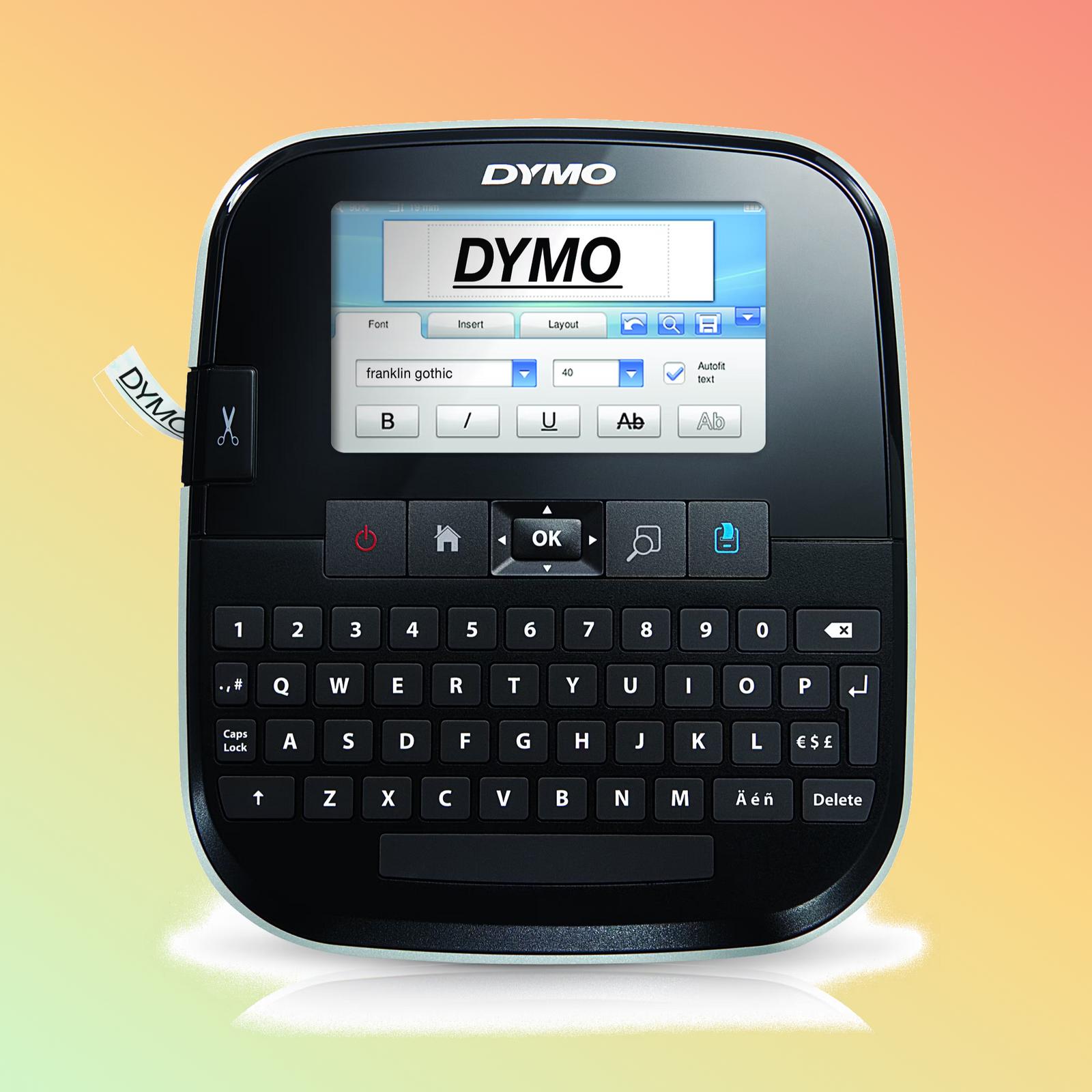 टेप संगतता : 6, 9, 12, 19, और 24 मिमी चौड़ाई में DYMO D1 लेबल का उपयोग करता है