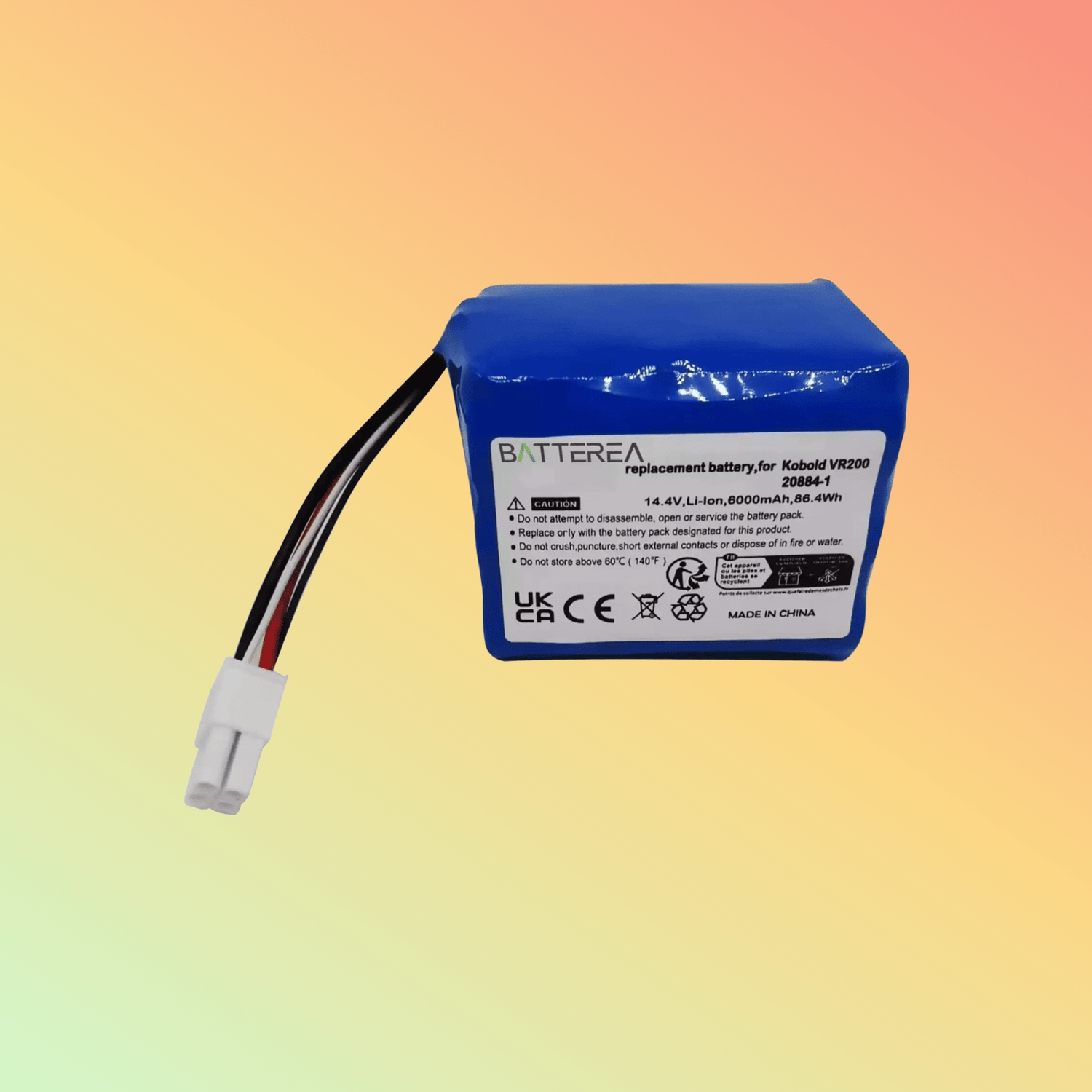 Maximize your Vorwerk Kobold VR200's cleaning efficiency with Batterea's high-capacity 14.4V 6000mAh Li-ion replacement battery. Replaces part number 20884-1 for extended runtime and reliability.