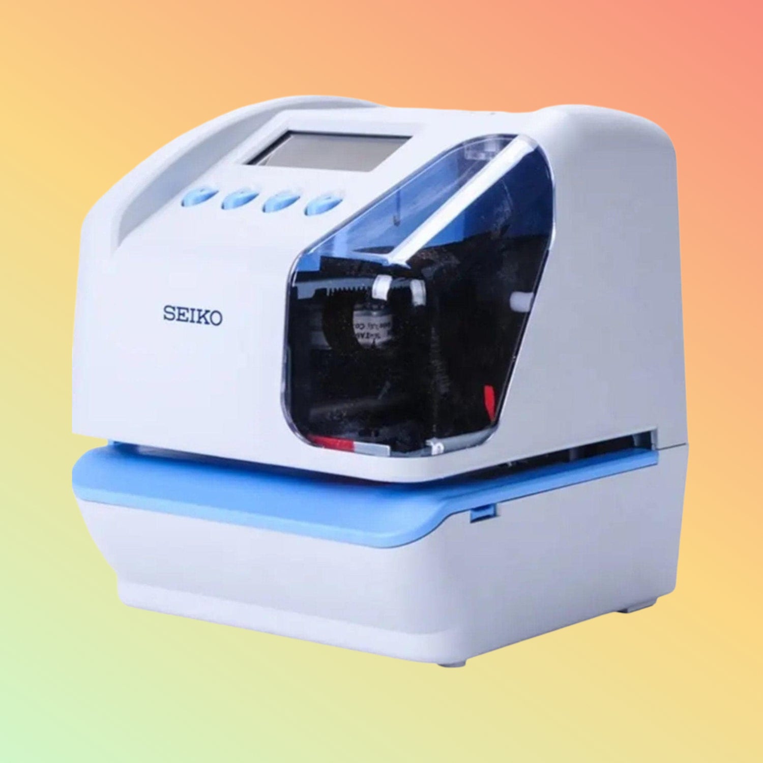 Seiko TP-50 programmable printer with 2-line stamping, USB setup, and custom counters. Ideal for businesses needing precise date and time tracking.